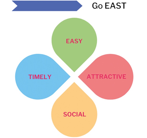 Cuando hablamos de usar nudges en el sector público, y también en el sector privado, el marco más usado es el desarrollado por el Behavioural Insights Team (BIT) (2014), que se compone de cuatro pasos. Normalmente se conoce con el nombre de EAST en referencia al método de intervención que implica y que es, a su vez, el paso central del marco del nudging. El término EAST hace referencia a los términos: fácil, atractivo, social y preciso (en inglés, easy, attractive, social y timely). Aunque también se han propuesto algunas versiones alternativas o pequeñas modificaciones como el FEAST, donde a la tradicional formula EAST se le añade el elemento de la diversión (fun) (Sunstein, 2020a). En este trabajo vamos a trabajar con el marco desarrollado en 2014 por el BIT, por ser la versión más extendida en lo que se refiere a la implementación de nudges.