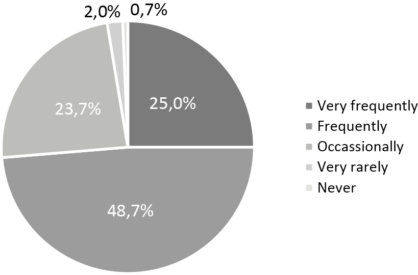 Taking the survey results at face value it would seem using active methodologies is mainstream in the Political Science and International Relations classrooms: 73,7 % respondents claim to use active methodologies Very Frequently (25 %) and Frequently (48,7 %) versus 23,7 % that say Occasionally and 3,7 % that respond to as Very Rarely (3 %) or never (0,7 %).