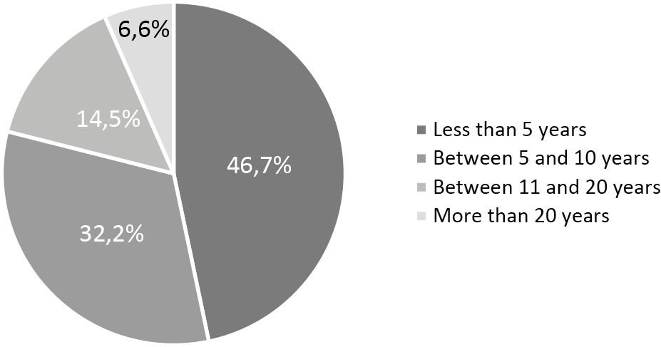 However, since the situation of the Spanish public system is one of a bottleneck, with professors having an average age of 47,2 (Rodríguez, 2018), years of professional experience do not necessarily correlate to rank. There are people with many years of teaching who are still in the early stages of the academic trophic pyramid. By contrast, rank is a variable of special interest for this study because it very much relates to situations of job security and “ownership” of courses. This is key because situational stability helps dictate if professors introduce modes of instruction other than lecturing and, in general, to innovate. It is for these reasons that rank is our selected independent variable, though we do take note of the years of professional experience of each of our interviewees as a guide. We required a minimum threshold of 2 years of teaching experience. This standard was set so the interviewee could at least compare the experience of one academic year without using active methodologies and another using them. This being said, the interviewee with least teaching experience has been in academia for four years.