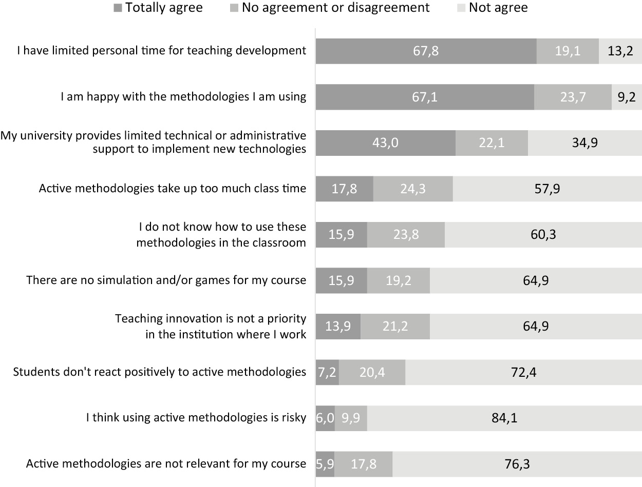 Q7. You can see a list of claims related to the main obstacles when implementing active methodologies. Provide the extent of your agreement to each one of them (totally agree, no agreement or disagreement, not agree).