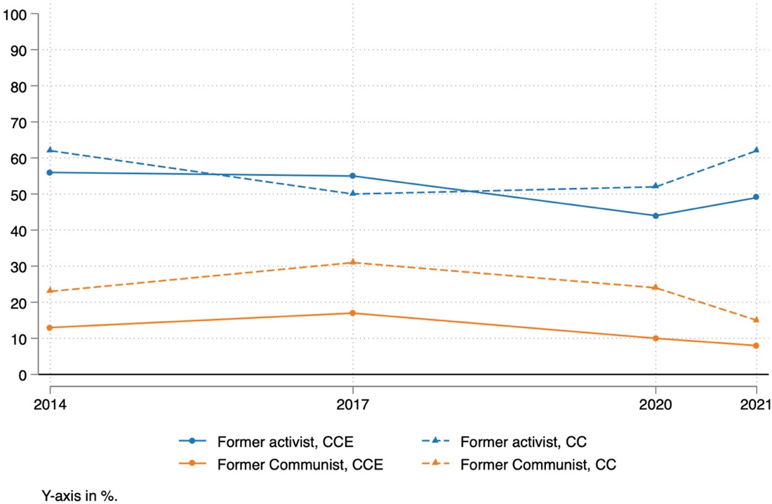 It is also true, as stated by many commentators, that there was an increasing influence of former communists within Podemos between 2014 and 2017, as shown by Figure 1. After the 2017 internal election, 17% of CCE members and 31% of CC members had personal experience in a communist organization, an increase of respectively 31% and 35%. However this evolution can hardly be considered a structural change in the organizational profile of Podemos. First, because the increase of former communist members was not dramatic: for instance, the 2017 CCE included 10 former communist members (out of 63), while the 2014 CCE included 7. Second, because this evolution was not confirmed in the 2020 and 2021 elections, where former communists only represented 10 and 8% of CCE members respectively, as well as 24% and 15% of CC members, as it is pointed out in Figure 1. This does not necessarily contradict the idea that top-ranking elites of Podemos with previous political experience in communist organizations, such as Irene Montero, Rafael Mayoral or Juan Manuel del Olmo may have had an increasing role in strategic party decisions. However, it somehow tempers accounts of a massive shift in political cultures between 2014 and 2017, since this alleged impulse of former communists in post-2014 Podemos did not translate into major changes as regards CCE and CC recruitment.