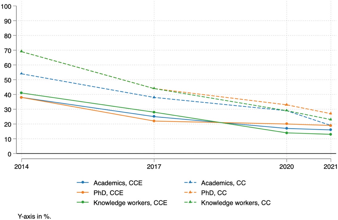 Figure 3 shows that there is indeed a sharp decrease in the proportion of academic CCE members, falling from 38% in 2014 to 24% in 2017, and CC members, falling from 54% to 38% in the same period. A similar tendency is observable for people doing or holding PhDs (38 to 21% among CCE members, 69 to 44% among CC members). The reduction goes on until 2021, with only 16% academics among CCE members and 19% among CC members. Actually, the decrease is even stronger than what these figures suggest, since many of those who entered the database as lecturers (and are here registered as such) later became members of the party staff or members of parliament (e.g. Pablo Bustinduy).