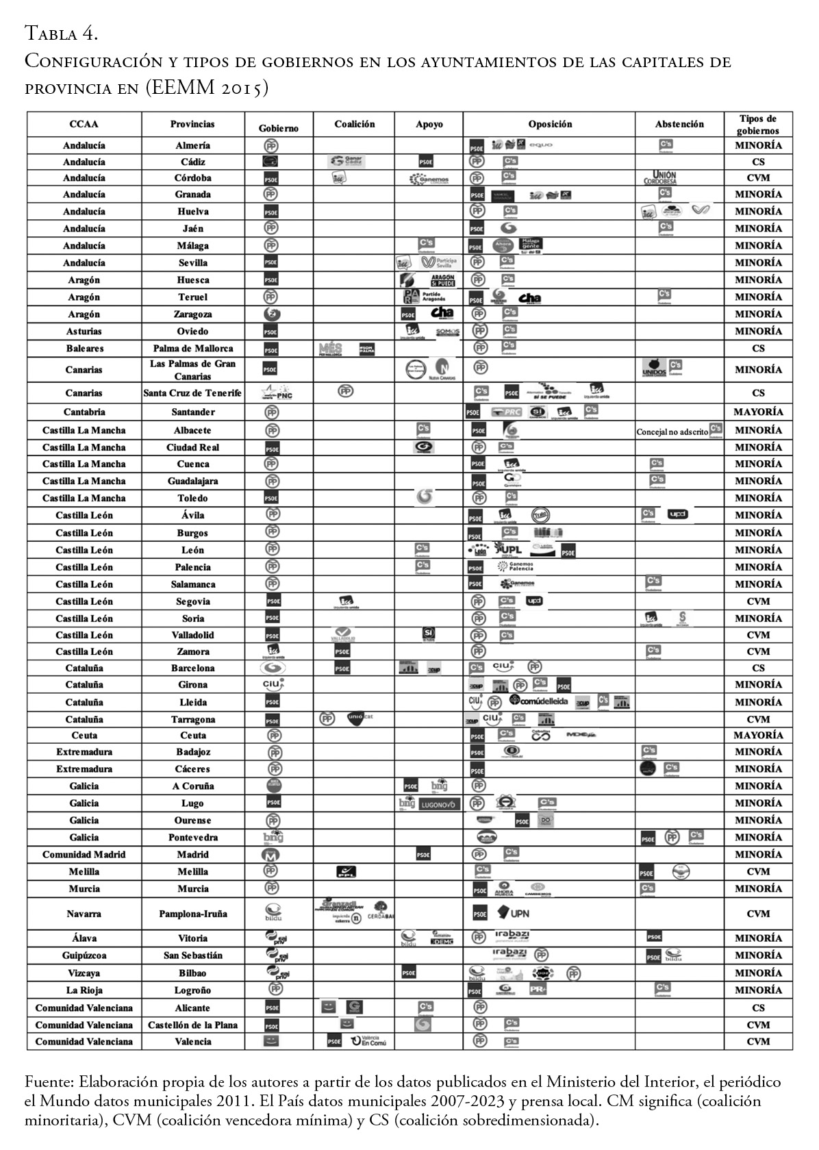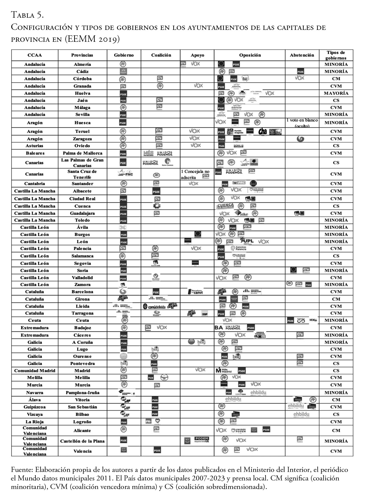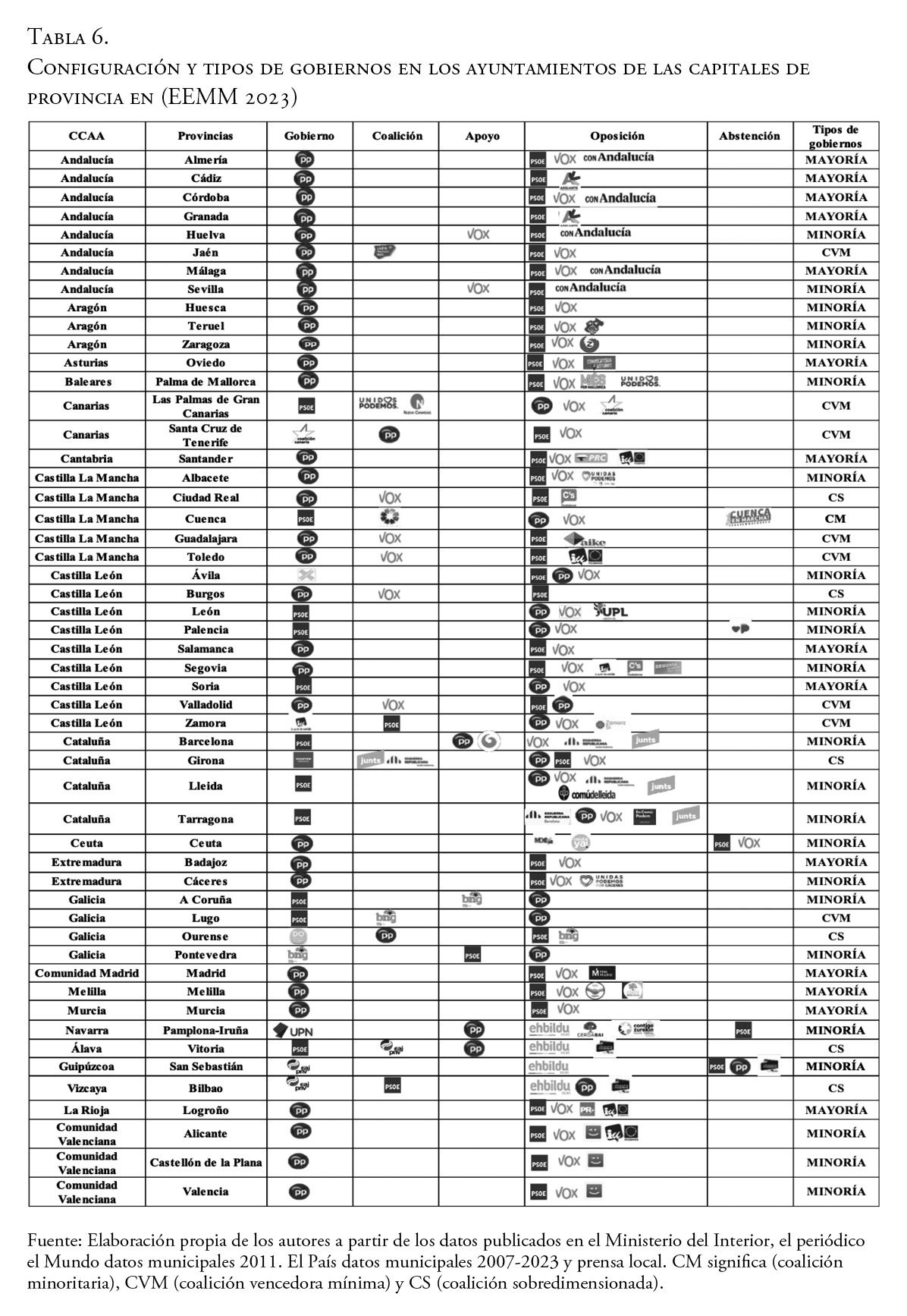 Las elecciones municipales de 2015 y 2019 transformaron los sistemas de partidos a nivel local hacia modelos multipartidistas y la desconcentración de poder históricamente en manos de los dos grandes partidos de ámbito estatal. Este estudio presenta una imagen global inédita de este proceso de cambio en la configuración política del poder en los ayuntamientos de las capitales de provincia y las dos ciudades autónomas españolas. Adopta una perspectiva longitudinal amplia, que abarca seis momentos electorales de las últimas dos décadas, analizando un total de 312 casos de elecciones de alcaldes. El análisis se fundamenta en una base de datos original que permite trazar las variaciones en el número de partidos con representación, los tipos de gobiernos en los que se sustentan la constitución de las alcaldías y las posiciones resultantes de los distintos partidos. Los resultados indican que, en 2015 y 2019, hubo un aumento en el número de partidos compartiendo el poder, en un contexto de reducción de gobiernos de mayoría a favor de coaliciones y gobiernos en minoría. En 2023, a pesar de un retorno a un escenario con menos partidos y un incremento de gobiernos de mayoría, no se puede afirmar que se haya vuelto al sistema de partido previo a la Gran Recesión, ya que los partidos mayoritarios como el PP todavía dependen de otras formaciones políticas para configurar los gobiernos de muchas capitales de provincias.