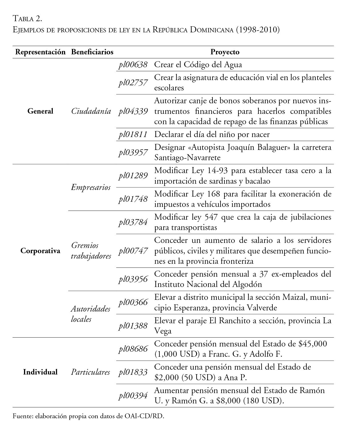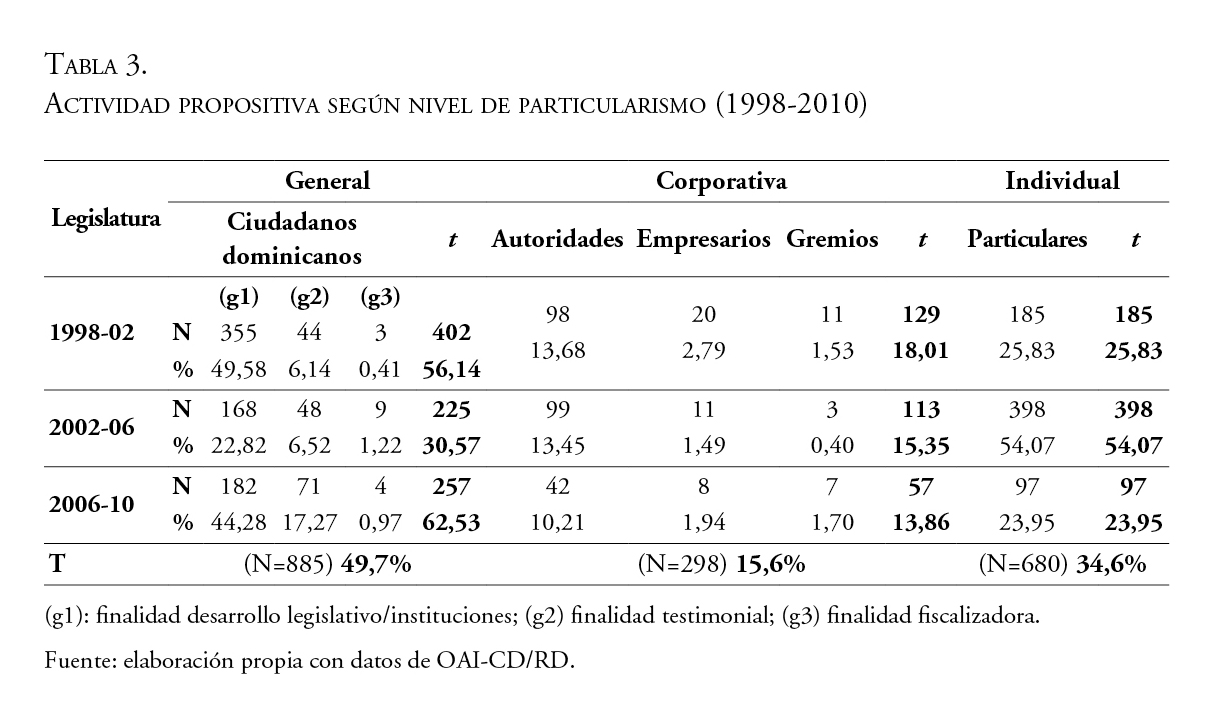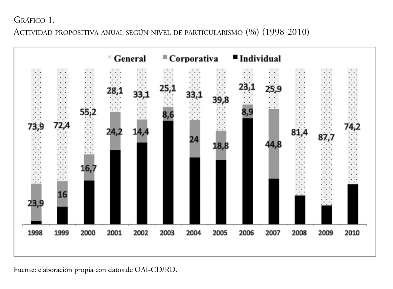 Este trabajo propone una clasificación del nivel de inclusividad de las proposiciones de ley para conocer cuál ha sido papel del Poder Legislativo en el arraigo o declive de la responsividad particular en la República Dominicana en el periodo 1998-2010, identificando variables institucionales y partidistas que condicionan el peso de los asuntos del distrito en las labores de representación. Los datos estadísticos evidencian que la personalización y la selección estratégica han prevalecido sobre la generalidad y la abstracción del mandato, limitando la vocación universal de la política pública del Poder Legislativo.