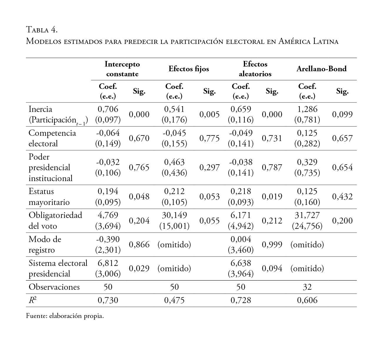 Fornos, Carolina A., Timothy J. Power y James C. Garand. 2004. «Explaining Voter Turnout in Latin America, 1980 to 2000», Comparative Political Studies, 37 (8): 909-940. Disponible en: https://doi.org/10.1177/0010414004267981.