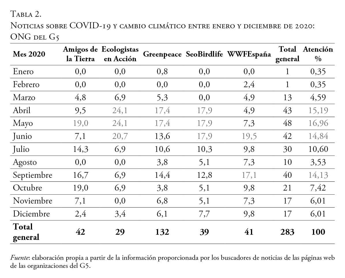 La pandemia de la COVID-19 ha supuesto un importante focus de atención para los actores políticos desde su irrupción en los medios en diciembre de 2020, y fue noticia principal a lo largo de varias semanas. ¿Qué ha implicado esto para las ONG del medio ambiente pendientes de otra crisis global como el cambio climático? ¿Cómo ha afectado la forma que tienen de formular y de interpretar los problemas por los cuales abogan? Siendo actores claves a la hora de definir y crear significados en torno a los problemas públicos, este artículo investiga hasta qué punto la pandemia ha supuesto una oportunidad para las ONG ecologistas para difundir y enmarcar temas como el cambio climático. Para responder a estas preguntas se realiza un análisis temático de las noticias publicadas entre enero y diciembre de 2020 por las cinco ONG del sector de mayor tamaño y presencia institucional en España. Se constata que los temas en los cuales han puesto énfasis son aquellos que tienen que ver con las similitudes de la crisis climática y la crisis de la COVID-19 en cuanto a su dimensión global y local. En cambio, al analizar el contenido de las noticias individuales de cada ONG, se observan diferencias importantes en parte relacionadas con su propia identidad organizativa.