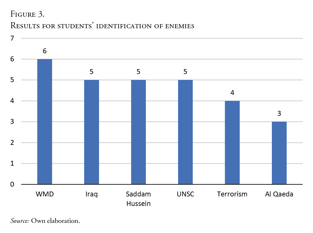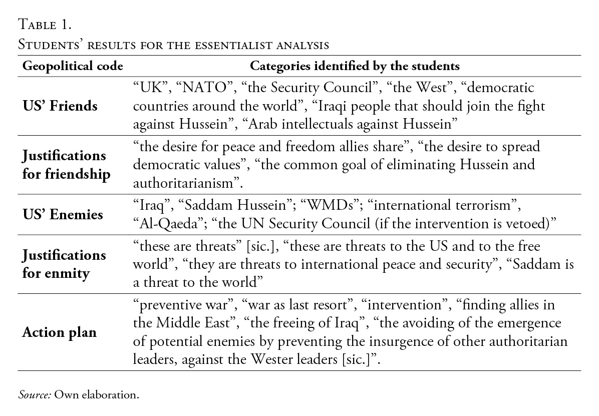 capaces de reflexionar sobre este código geopolítico como construcción social que legitima la acción militar. Estas evaluaciones también muestran que los estudiantes son capaces de aplicar lo aprendido en esta actividad específica a otros discursos geopolíticos, mostrando así cómo la actividad les ayuda a desarrollar un pensamiento crítico fuera del aula. En este sentido, el artículo concluye que el aprendizaje activo puede ser útil para los instructores que enseñan enfoques críticos en relaciones internacionales u otros campos similares. Hacer que los estudiantes trabajen con sus conocimientos permite a los alumnos comprender mejor cómo producir análisis críticos y captar su peso político.