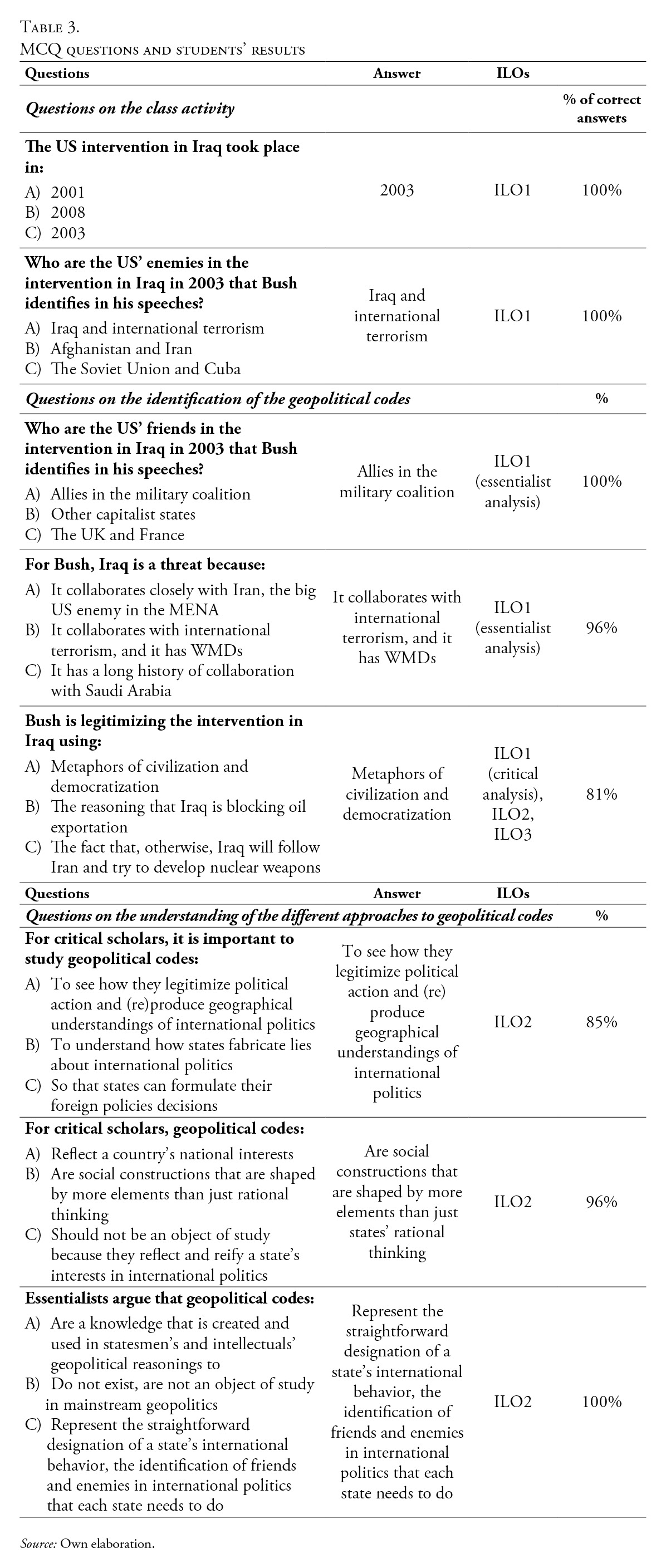 Este artículo describe una actividad que diseñé para que los alumnos comprendieran mejor los enfoques críticos de la geopolítica. La actividad se centra en la deconstrucción del código geopolítico de Estados Unidos en relación con la intervención de 2003 en Irak. El artículo describe la actividad y, a continuación, evalúa el aprendizaje de los alumnos mediante cuatro tipos diferentes de revisión y evaluación. En general, las distintas evaluaciones muestran que los alumnos lograron alcanzar los principales resultados de aprendizaje de la actividad; es decir, ser