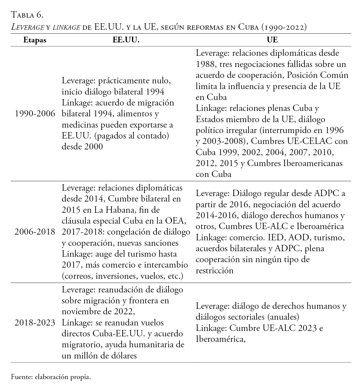 Desde la imposición del embargo de Estados Unidos (EE.UU.) hace más de sesenta años, Cuba ha sido un laboratorio de promoción de la democracia para fomentar un cambio de régimen por parte de Washington y una apertura política desde Bruselas. El mantenimiento del unipartidismo evidencia no solo el fracaso de estas políticas sino su contribución a la consolidación del régimen revolucionario que gobierna desde 1959. Este artículo se pregunta, desde un marco analítico cualitativo y comparado, por qué ambos actores mantienen sus respectivas políticas. A tal fin, explora la dinámica entre los instrumentos y resultados de las políticas de promoción democrática de EE.UU. y la Unión Europea (UE) hacia Cuba. Se fundamenta en los postulados teóricos de regímenes políticos, transiciones y promoción democrática vía compromiso constructivo por parte de la UE o desde la coerción vía sanciones de Estados Unidos.
