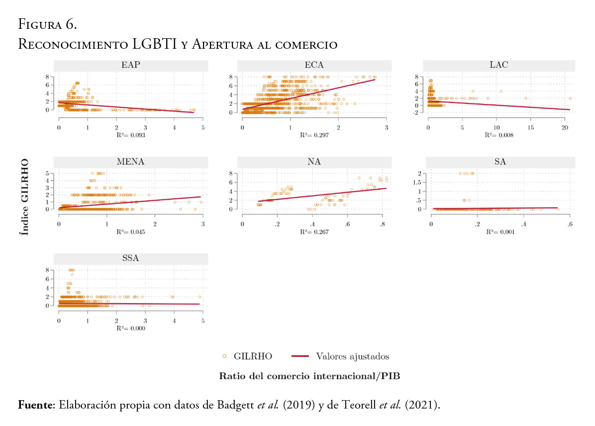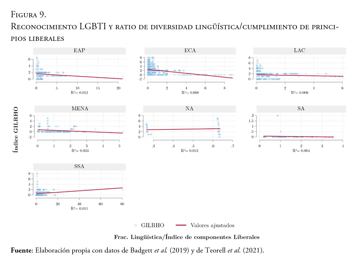 Los derechos LGBTI varían globalmente en cuanto a regiones y países, y aunque se conocen factores como instituciones políticas y religión que influyen en esta variación, la naturaleza y forma de estas relaciones es poco estudiada y muchas veces se modela de manera lineal o no se modeliza aspectos importantes destacados de la literatura como la persistencia institucional o la influencia del pasado. Usando el índice Global de Reconocimiento de la Orientación Homosexual (GILRHO) y diversos indicadores institucionales, culturales y demográficos recopilados en el Quality of Government Dataset, se analizó un panel de 144 países durante 46 años. Para lograr corroborar el objetivo de identificar los factores determinantes del reconocimiento legal de las personas LGBTI se utilizó modelos de datos de panel dinámicos robustos a sesgo de paneles dinámicos y a perturbaciones no normales en los errores (autocorrelación serial, heterocedasticidad y correlación contemporánea). Se encontró que la relación entre instituciones, inclusión y religión en el reconocimiento legal LGBTI es no lineal e intertemporal (que el pasado incide en el presente). Los resultados son consistentes con lo discutido en la literatura sobre el reconocimiento legal LGBTI en el contexto de la ciencia política comparada.