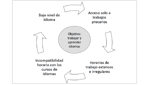 A pesar de la descompensación que existe entre la cualificación que tienen y los trabajos que realizan, dichos trabajos se aceptan de buen grado porque se considera que tienen un carácter provisional: “Quería coger algo básico mientras avanzaba en algo de inglés, después seguir moviéndome a algo mejor, como hacen todos allí.” (José, H_M_UK_TA). El problema es cuando los trabajos precarios se convierten en el empleo definitivo durante toda su estancia y, además, sienten que están atrapados en un “bucle de precariedad” (ver figura 2) del que no pueden salir. Sus circunstancias laborales solo les permiten malvivir, además, no les dejan, ni siquiera, poder aprender el idioma del país, lo que frena uno de sus principales objetivos y hace que su estancia en el extranjero pierda el sentido: