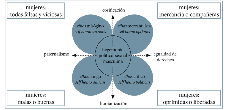 No cabe duda que para entender la demanda masculina de sexo comercial se debe tener en cuenta el carácter estructurado y estructurante del propio sistema prostitucional (Connell, 2003; Bourdieu, 2000). Para ello, es preciso acudir a la interconexión compleja de sistemas de estructura-acción que apuntan la distintas siguientes variables: un momento sociohistórico de auge del neoliberalismo consumista; una estructura de oportunidad favorable en un contexto legislativo propicio; una ocasional connivencia entre autoridades e industria sexual; unos lobbys de comunicación mediáticos que legitiman y publicitan esta industria sexual floreciente y organizada; un sistema de organización prostitucional alienante y concentracionario (Tiganus, 2017; Atencio, 2015); un cambio en el paradigma afectivo-sexual de la población; y, por último, un modelo de masculinidad patriarcal que pivota en la idea hipersexual de la virilidad (De Miguel, 2015). En las investigaciones realizadas sobre los clientes-prostituidores a través de la Universidad de Vigo (Gómez y Pérez, 2009) se concluye de la inexistencia de un perfil sociológico concreto entre el grupo de hombres que pagan por tener sexo con mujeres: ni la edad, ni la clase social, ni el hábitat, ni la etnia, ni la formación, ni la ocupación o la ideología política, sirven para perfilar un modelo estadístico estereotipado, en consonancia con resultados de otros estudios coetáneos. Los relatos de estos hombres se clasificaron en cuatro categorías siguiendo los postulados metodológicos del «fra-me analysis» (Goffman, 1974) en los que se establecen marcos interpretativos de la práctica social y serían: misógino (odio a la mujer); consumista (compra lo que se vende); amigo (empático sin politizar); y crítico (ocasional y arrepentido). En el gráfico que se expone a continuación, se representan estas cuatro disposiciones en relación con su sexismo y el imaginario femenino vinculado a las mismas y en el que ambos se retroalimentan (analizado también en los relatos ofrecidos por las mujeres entrevistadas en situación de prostitución). De esta manera, las mujeres se adecúan a los preceptos que poseen los varones de ellas, en aras de optimizar la relación comercial. Los dos ejes principales están definidos por la reificación y consideración de igualdad hacia las mujeres. En todos los casos, el contexto estructurante se proyecta en un patriarcado moderno de alto impacto (Segato, 2014).