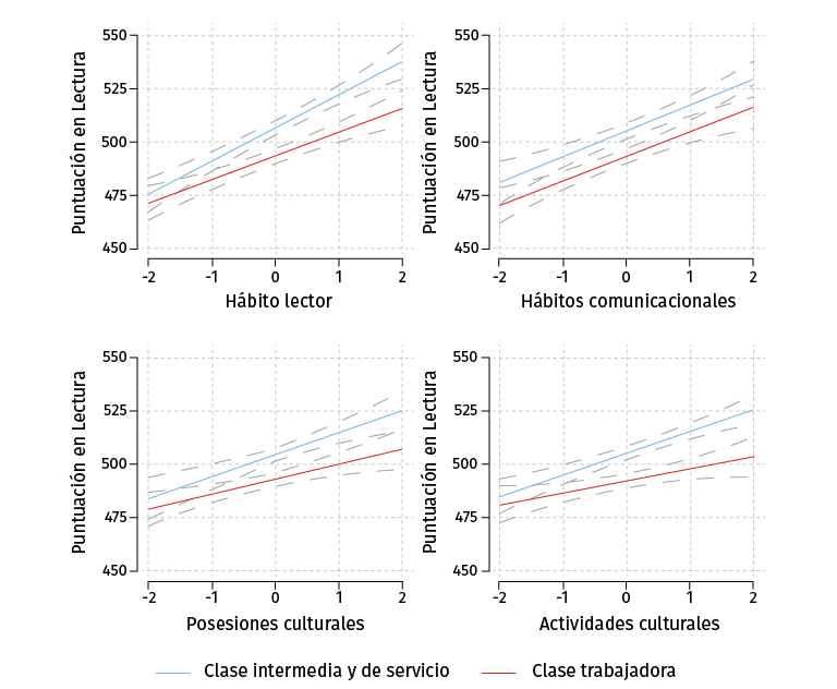 En particular, el hábito lector (indicativo de la función de desarrollo de habilidades cognitivas) y la participación en actividades culturales (indicativo de la función simbólica del capital cultural) son los indicadores de capital cultural que muestran una interacción más intensa con el origen social, y eso tanto para la explicación de la competencia lectora como para el estudio de la competencia matemática. De esta forma, no sería posible atribuir los diferentes resultados observados a nivel internacional sobre la interacción entre origen social y capital cultural a la operacionalización de una u otra dimensión del capital cultural. No obstante, cuando comparamos alumnos de clase trabajadora con alumnos de clase de servicio, las interacciones más intensas se observan para las posesiones culturales y la participación en actividades culturales, esto es, para la participación en la alta cultura. Así pues, es posible que parte de esa heterogeneidad de resultados a nivel internacional esté relacionada con los grupos sociales que se ponen en comparación en los distintos trabajos.