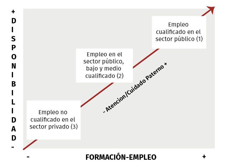 Y aún es menor la contribución, incluso en algunos casos es escasa, en los hogares en los que el padre trabaja en el sector privado y su formación es baja. El padre no está completamente ausente, pues además de realizar alguna tarea en el hogar suele compartir horas de ocio y compañía en general con sus hijos e hijas, pero es la mujer la que, en gran parte, asume todas las tareas domésticas.