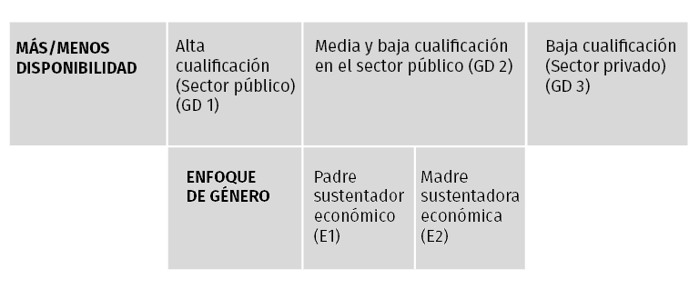 Tras la revisión bibliográfica relacionada con el tema objeto de estudio (Ajenjo et al., 2018; Gracia y Esping-Andersen, 2015; Gough y Killeward, 2011; Monna y Gauthier, 2008) se consideró, como se puede apreciar en la Figura 1, que la mayor o menor atención y cuidado de los hijos e hijas se encuentra condicionada por la posición que el progenitor ocupa en la estructura sociolaboral, definida ésta por el eje que determina una mayor o menor disponibilidad horaria (concretándose la misma según el empleo se desempeñe en el sector privado o público) y por el eje que califica el empleo según sea éste más o menos cualificado (Gracia y Ghyselsb, 2016; Falquer et al., 2016; Feinberg, 2003). El cruce de esto dos ejes, como se puede apreciar en la Figura antes mencionada, determinaron tres grupos de discusión formado por niños y niñas con edades entre 12 y 14 años. Uno constituido por hijos e hijas cuyos padres cuentan con un empleo altamente cualificado en el sector público; un segundo, constituida por hijos e hijas cuyos padres tienen un empleo de baja o media cualificación en el sector público; y un tercero, constituido por hijos e hijas cuyos padres tienen un empleo no cualificado en el sector privado.