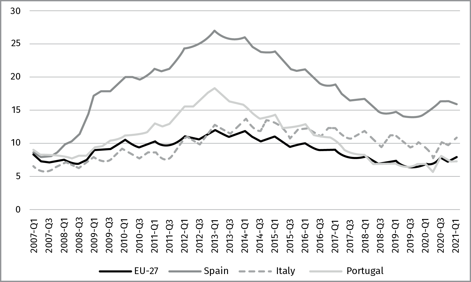 Figure 1. Quarterly Evolution of the Official Unemployment Rate in the EU-27,(1) Spain, Italy and Portugal (2007-2021).
