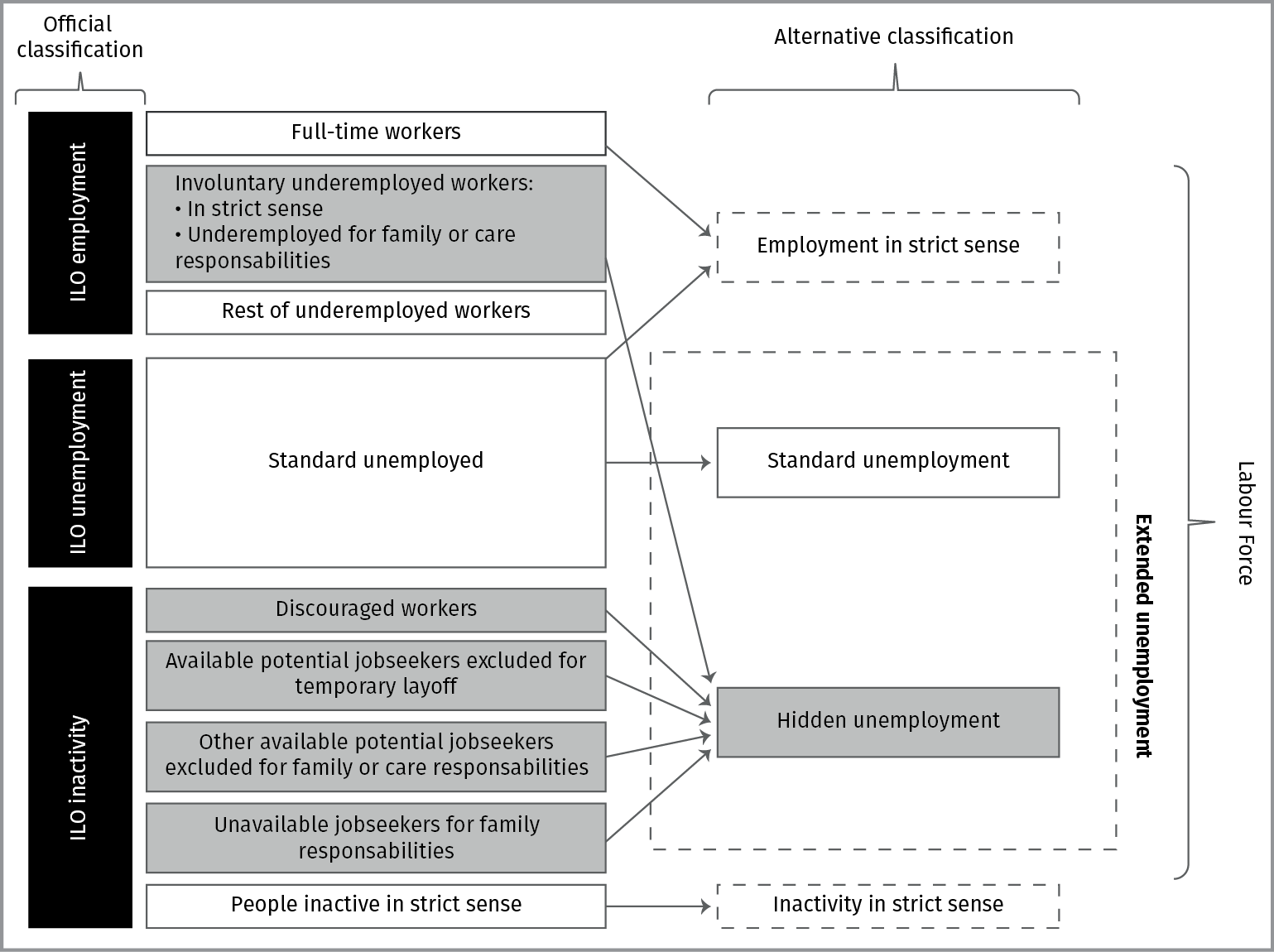 At this juncture, we need to clarify that the inactive population segments listed under hidden unemployment in our measurements, have been subjected to a restrictive approach. Although we go beyond the proposals that include only discouraged workers, we are still far from those that include the entire potentially active population. Thus, in addition to the habitual interpretation used for the unemployed population, we add the conventionally inactive segment included in hidden unemployment. This population is particularly exposed to the risk of social exclusion and it represents a loss in the productive capacity of a national economy. This is very similar to what we can say about those who work in extremely reduced hours against their wishes. That is the reason why we have limited underemployment, in terms of the actual and desired working day, while we have also expanded the reasons for unwillingness to work in order to better capture the situation of people –mainly women– who are not seeking employment or are not available to work in the short term due to the restrictions they face under existing gender norms that push them to be responsible for dependent care.