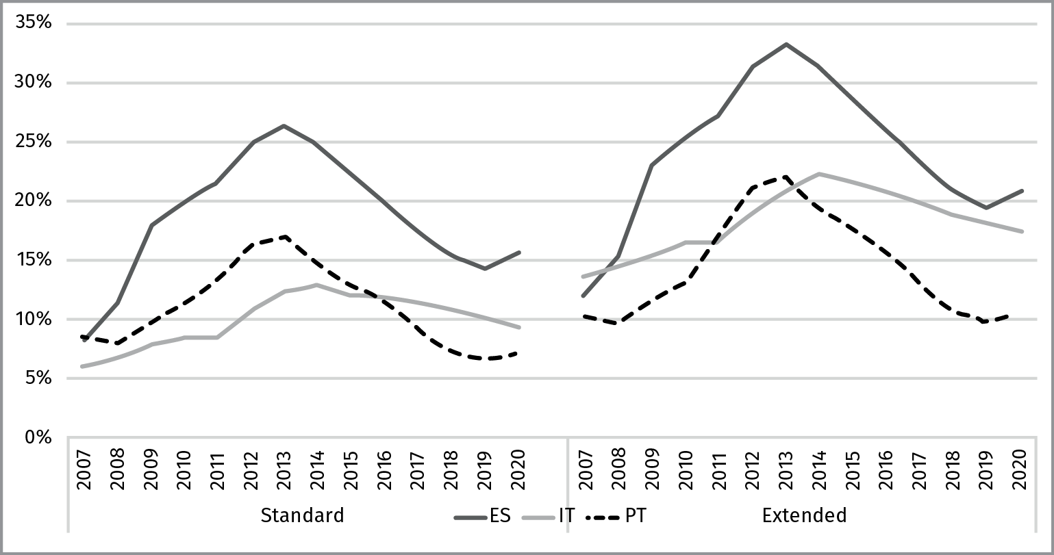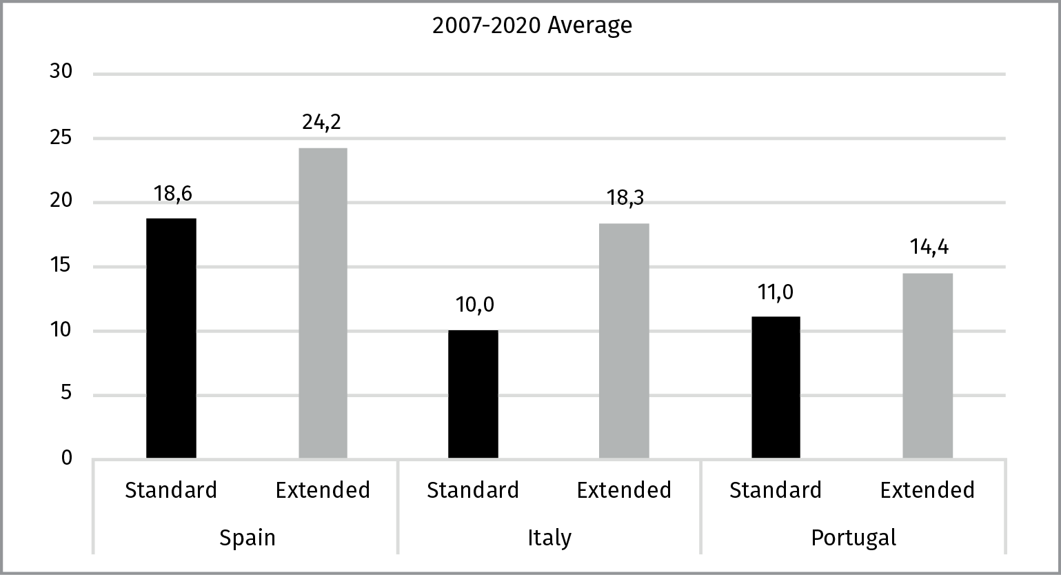 Figure 4. Standard and Extended Unemployment Rates in Spain, Italy and Portugal (average 2007-2020).