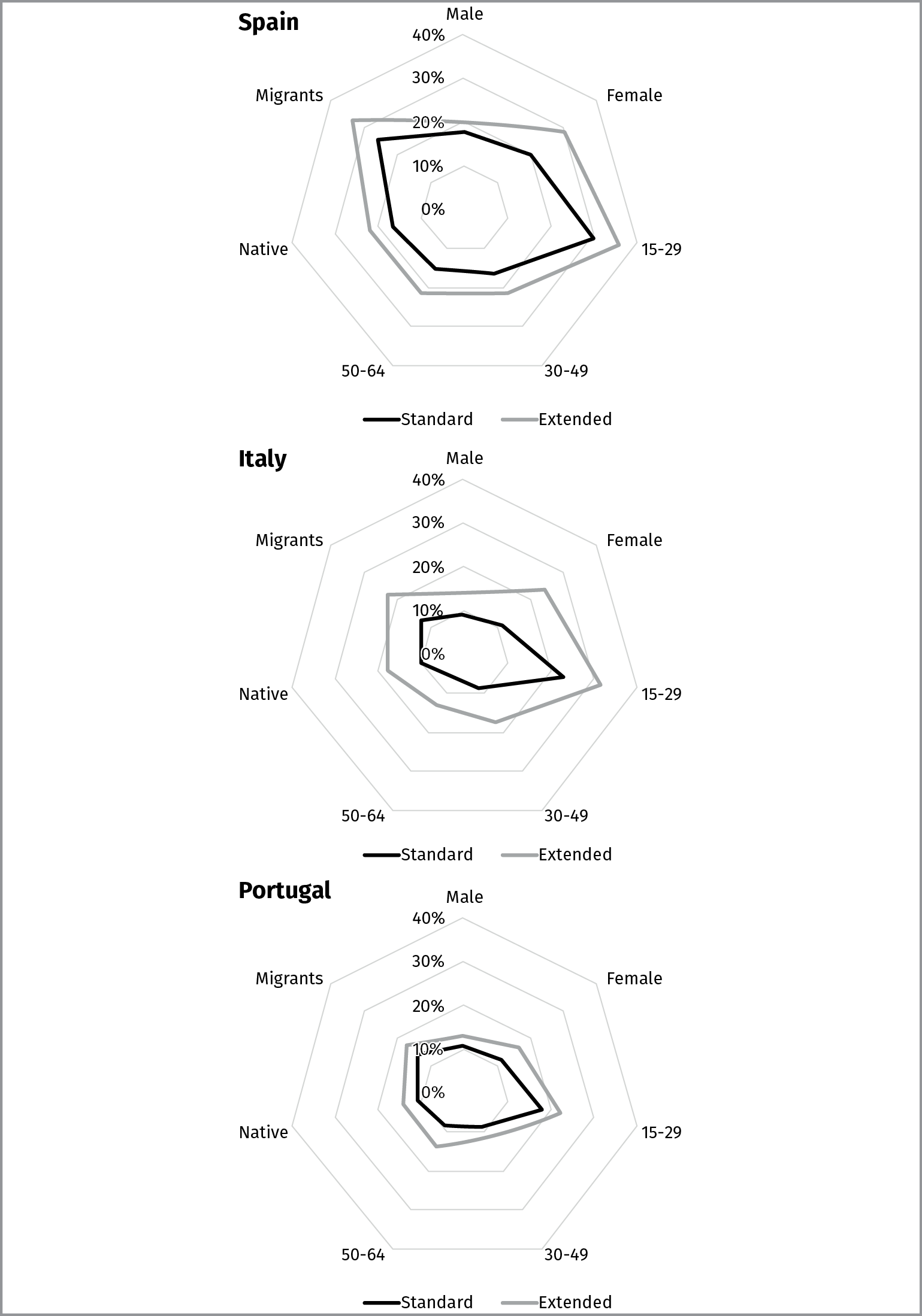 Figure 5. Standard and Extended Unemployment Rates by Sex, Age and Country of Birth in Spain, Italy and Portugal (2007-2020).