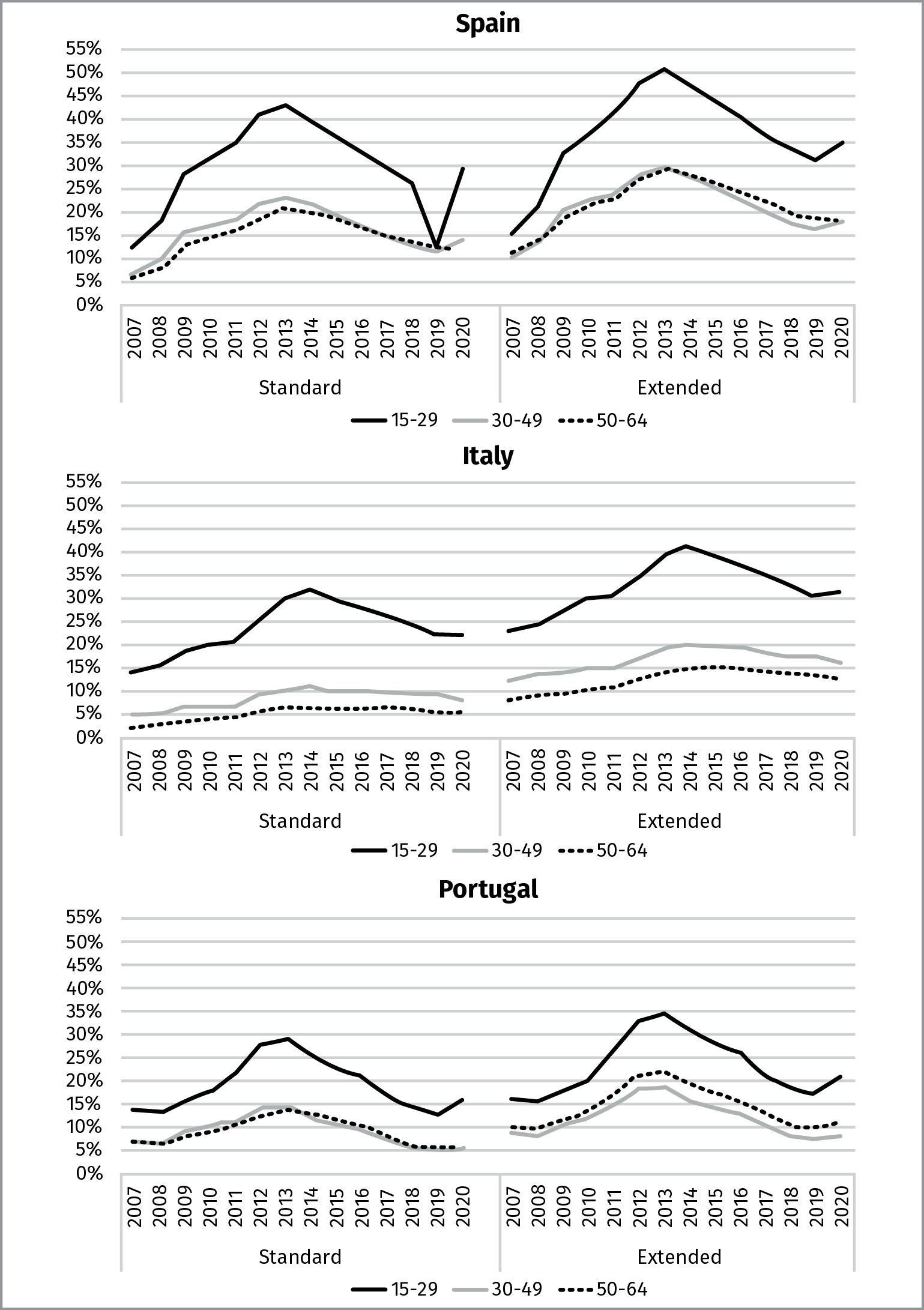 Figure 6. Standard and Extended Unemployment Rates by Age in Spain, Italy and Portugal (2007-2020).
