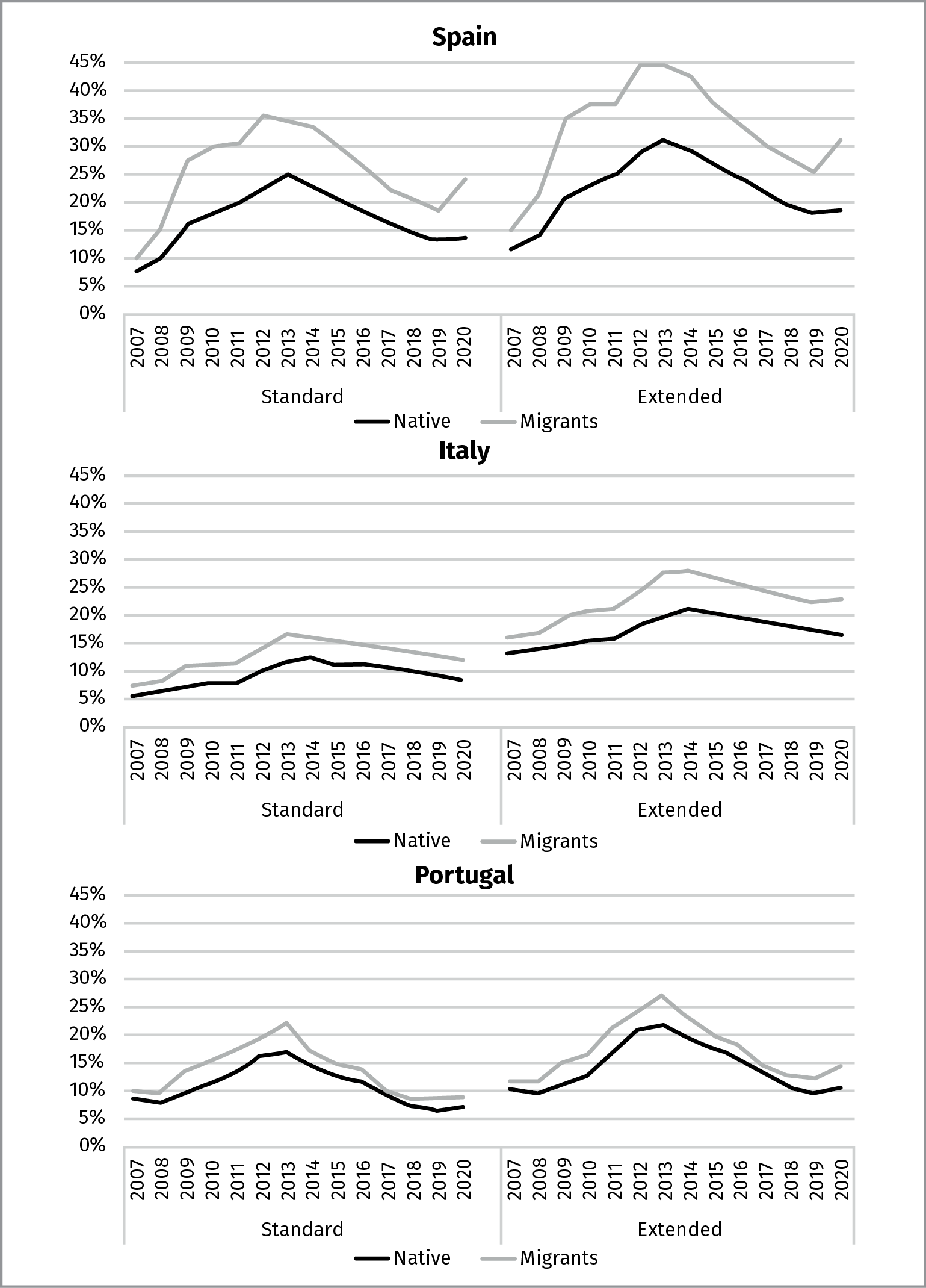 Figure 7. Standard and Extended Unemployment Rates by Country of Birth in Spain, Italy and Portugal (2007-2020).