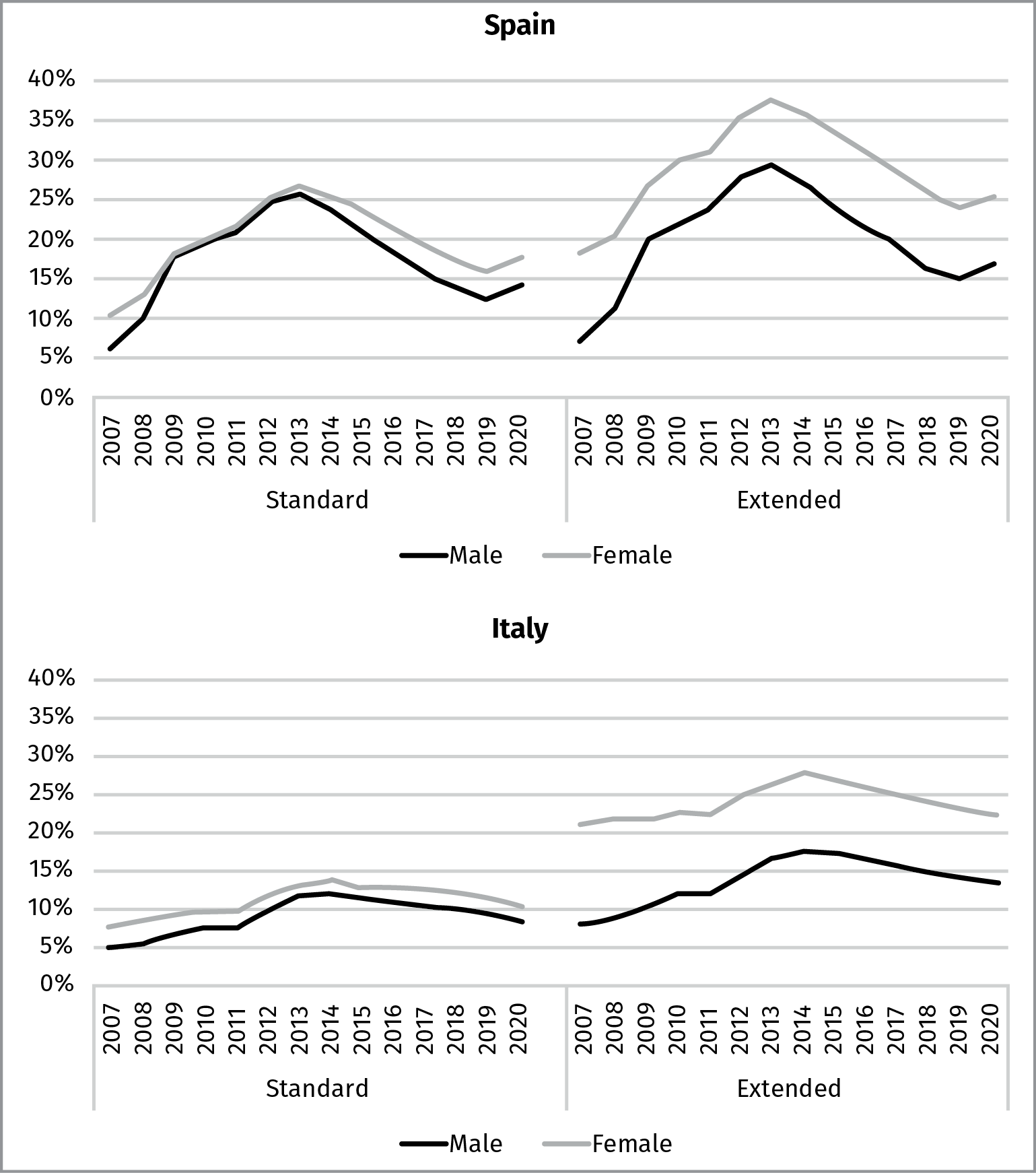 Figure 8 Standard and Extended Unemployment Rates by Sex in Spain, Italy and Portugal (2007-2020).