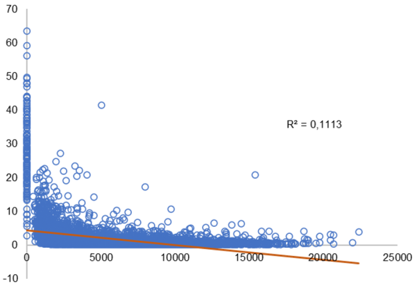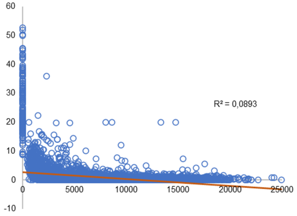 Figura 2 Relación entre la distancia entre los barrios y el porcentaje del flujo de movilidad cotidiana en 2018. Madrid