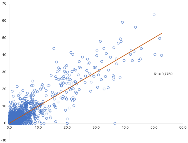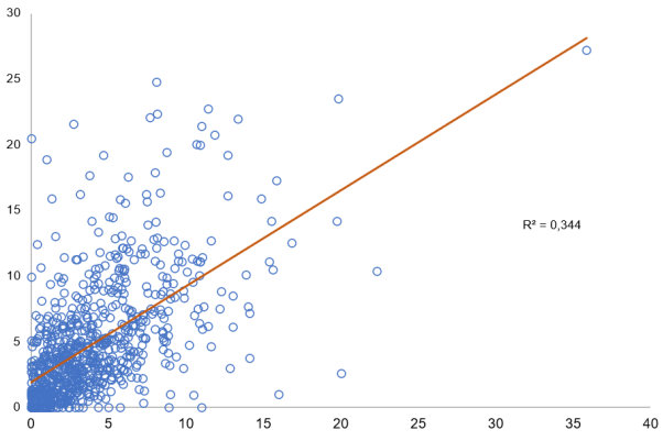 No obstante, más que la distancia física, es la relación entre ambos tipos de movilidad lo que más contribuye a explicarlas. Como se aprecia en la figura 3, hay una relación lineal muy intensa, con un R2 de 0,78 entre el porcentaje de peso de los barrios de destino de ambas formas de desplazamiento. Se podría argumentar que esto sucede porque el principal destino de los desplazamientos en la ciudad de Madrid es el propio barrio, tal y como ha sido argumentado anteriormente. Sin embargo, excluyendo del análisis los barrios de origen y teniendo en cuenta exclusivamente los adyacentes a estos, se sigue dando una intensa -aunque menor- relación lineal, tal y como se muestra en la figura 4.