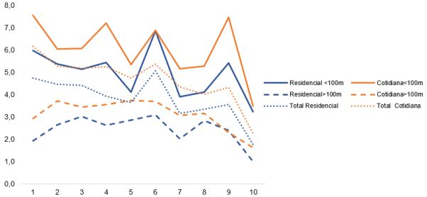 En la figura 6, se ha puesto en relación la movilidad residencial y cotidiana entre los barrios contiguos con la desigualdad de renta entre ellos. Para ello se ha clasificado esta desigualdad en deciles -situados en el eje horizontal, de manera que cuanto más alto es el decil, más elevada es la desigualdad-, y hemos situado en el eje vertical el porcentaje de desplazamiento residenciales y cotidianos entre barrios, en función de dichos deciles.